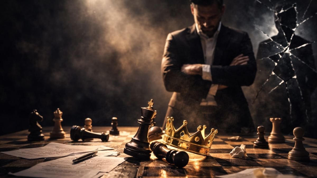 Homem maduro ajustando peça de xadrez rei em tabuleiro de madeira escura sob iluminação suave cinematográfica, simbolizando decisão estratégica e liderança adaptativa.